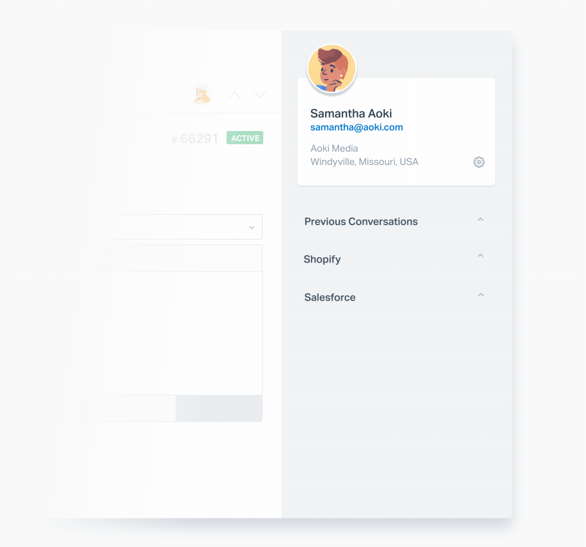 You can personalize your conversations with accessible customer relationship data. Everything you need to know about the person you're replying to is in the sidebar — contact information, previous conversations, and data/activity from other apps.